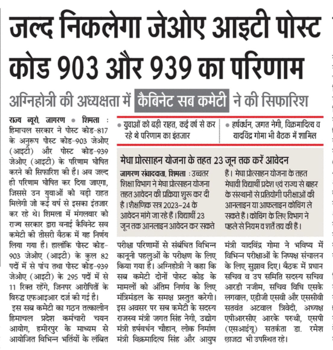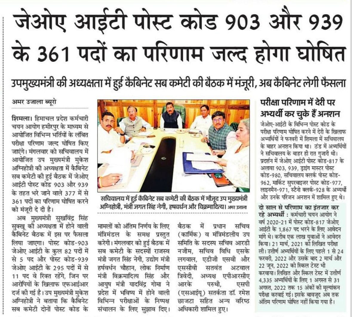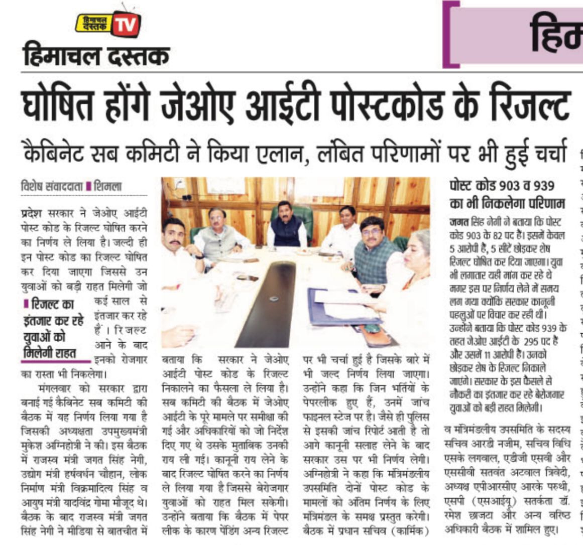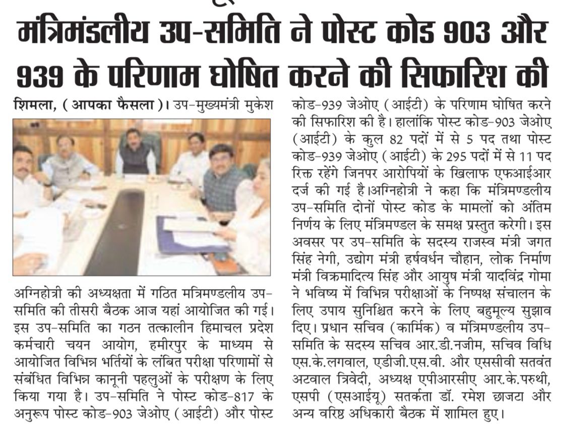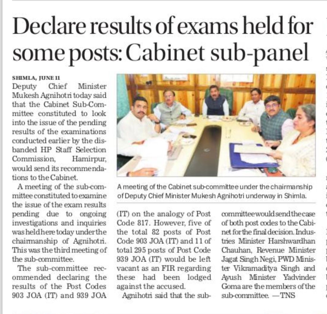 Cabinet Sub Committee Meeting 11 June 2024 Cabinet Sub Committee Meeting Regarding the pending Results and pending issue related results and examinations conducted earlier by the HP Staff Selection Commission.