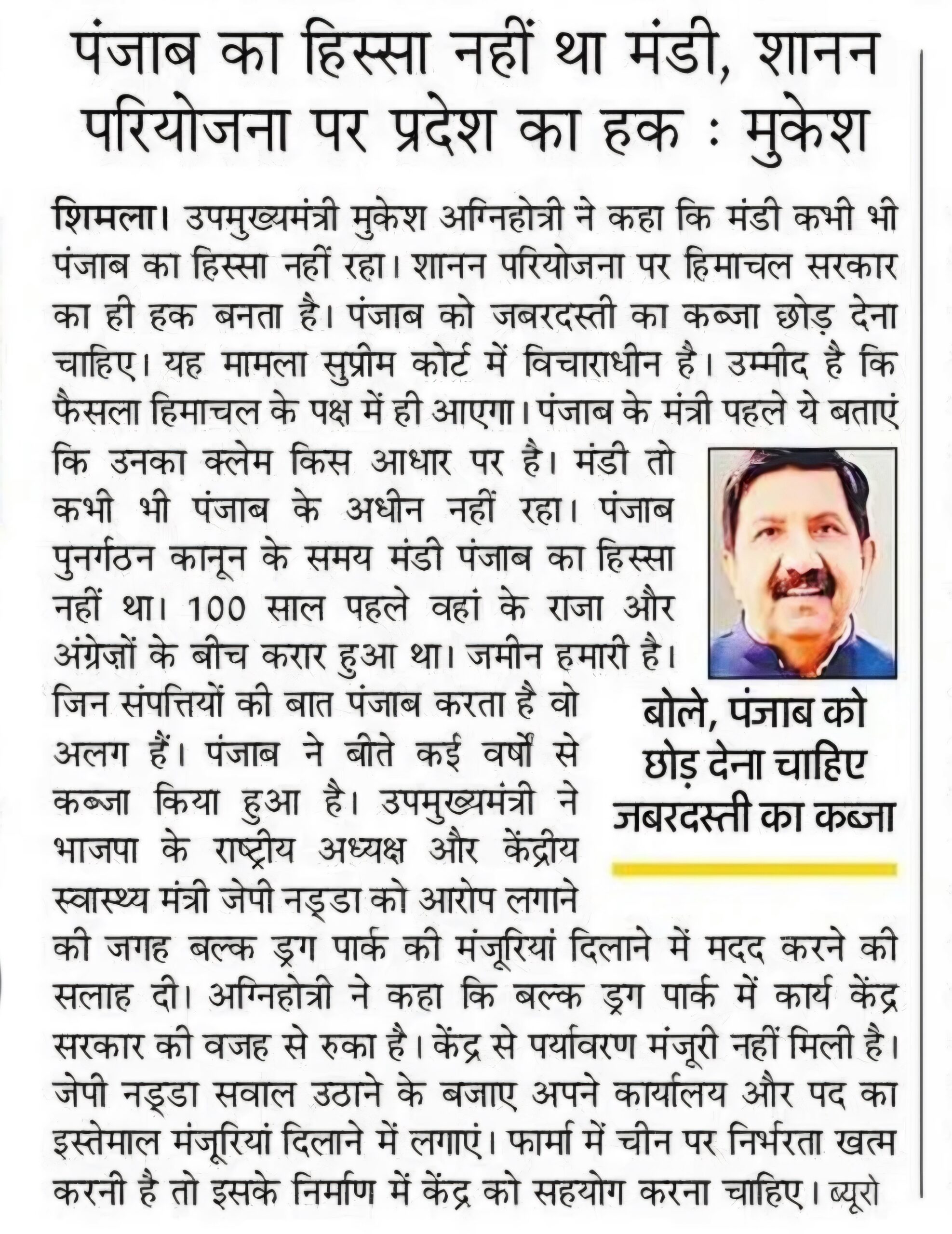 उपमुख्यमंत्री मुकेश अग्निहोत्री ने कहा कि बल्क ड्रग पार्क परियोजना के निर्माण को लेकर हिमाचल सरकार पूरी तरह से गंभीर और प्रतिबद्ध है। हम तत्परता से इसे गति देने का काम कर रहे हैं।