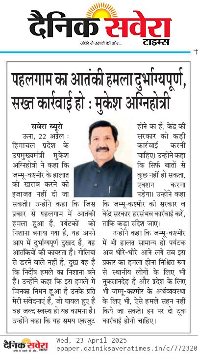 ऊना, 24 अप्रैल. उपमुख्यमंत्री मुकेश अग्निहोत्री ने कहा कि आतंकवाद पर राष्ट्रहित में उठाए हर निर्णय में कांग्रेस पार्टी केंद्र सरकार के साथ है। उन्होंने जम्मू-कश्मीर के पहलगाम में हुए आतंकी हमले में निर्दोष लोगों की निर्मम हत्या पर गहरा दुख व्यक्त करते हुए कहा कि कांग्रेस पार्टी इस कायराना हरकत की कड़े शब्दों में निंदा करती है। उन्होंने इसे अमानवीय और दिल दहलाने वाली घटना करार दिया।